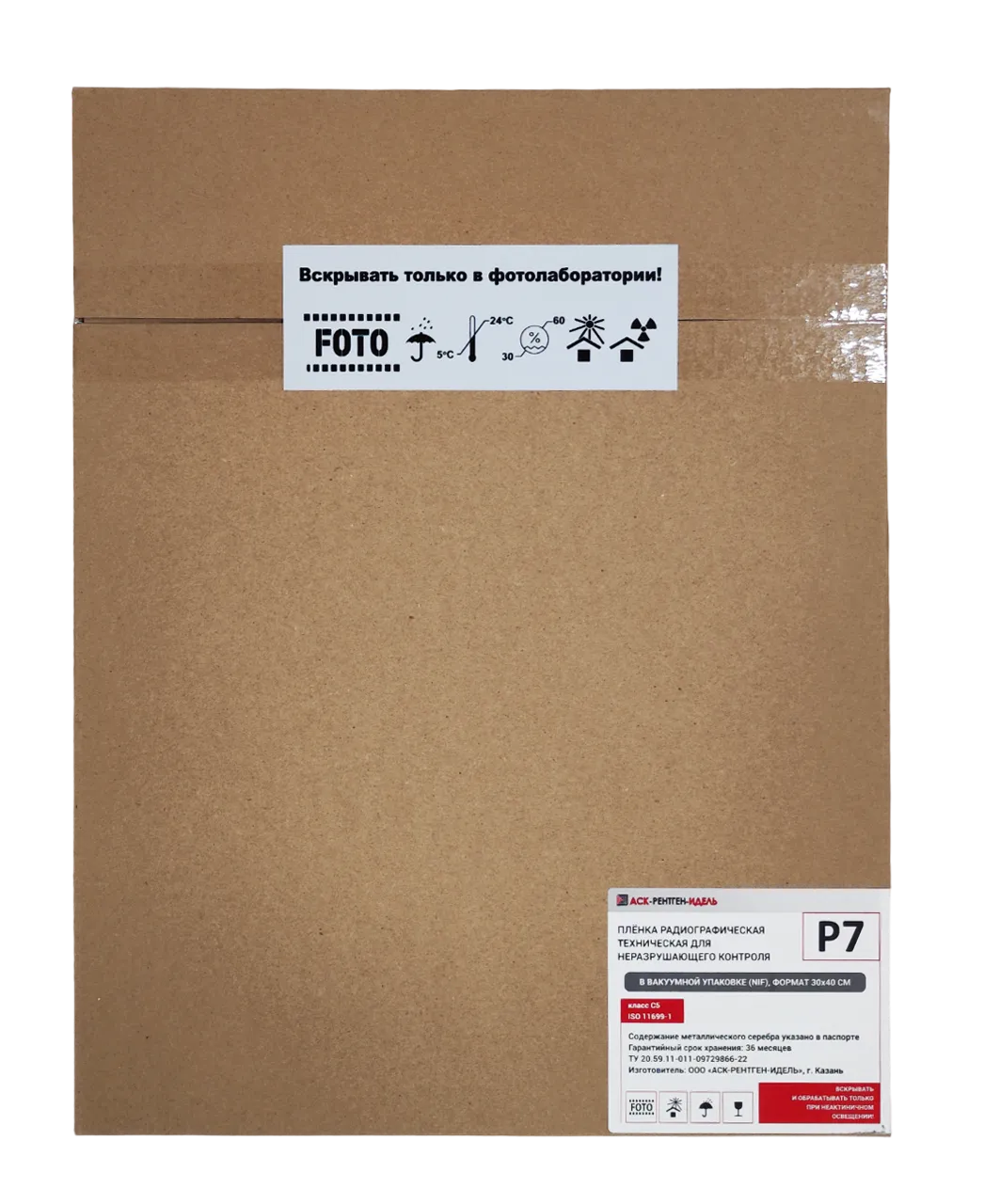 Техническая радиографическая мелкозернистая пленка Р7 обладает средней чувствительностью, но высокой степенью контрастности. Пленка Р7 дает возможность выполнять рентгеновские снимки высокого качества и надежно воспроизводимые и с минимальным количеством брака. Пленка Р7 обладает определенной стойкостью к механическим воздействиям, сжатию, царапинам, зацепам, а также влиянию статического электричества за счет наличия специального защитного слоя. Изготавливается пленка по стандартной классической технологии с нормальным содержанием серебра и без оптических сенсибилизаторов.